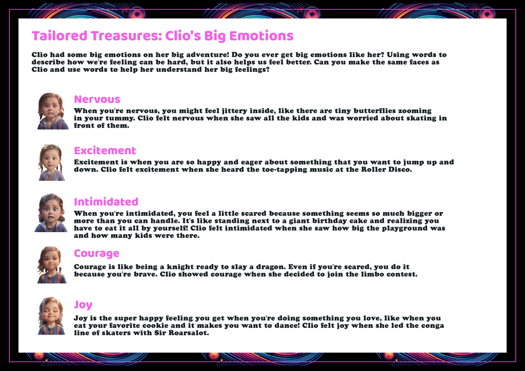 Clara’s Magical Summer Swirl: A 2 story Mosaic book written for 4 year old Clara who loves soccer, cheerleading, gymnastics, and swinging. Clara is learning to wear replace her cozy winter clothes for summer wear, and is also learning to manager her big emotions when things don’t go her way.